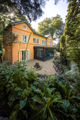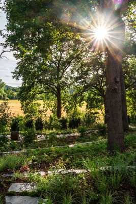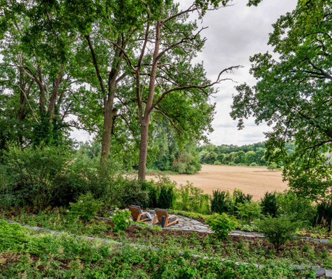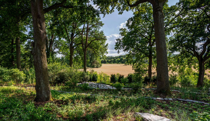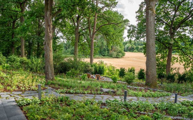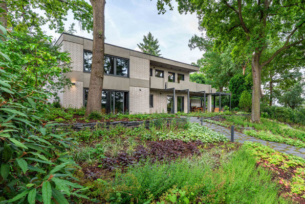 Ein moderner Privatgarten, der Architektur und Natur miteinander verbindet. Der helle Bauhausstil des Hauses trifft auf den Charakter alter Eichen, die den Garten prägen.