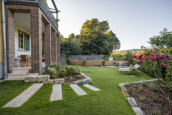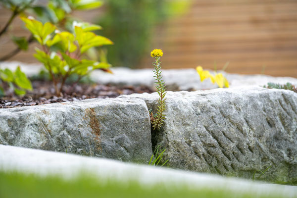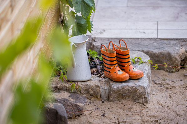 Dieser Garten verbindet ästhetische Gestaltung mit praktischen Lösungen für den Familienalltag. Natursteinmauern aus Sandstein gliedern den Raum harmonisch und schaffen geschützte Bereiche zum Spielen und Entspannen. Ein Rankgerüst aus Massivholz dient als stilvoller Sichtschutz, während Travertinplatten auf der Terrasse und als freie Trittstufen im Rasen ein mediterranes Flair erzeugen.
