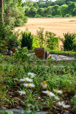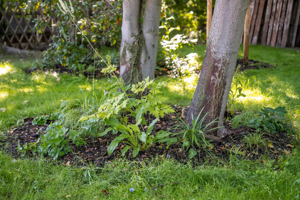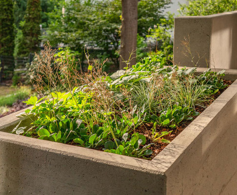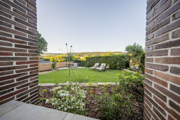 Die automatische Bewässerungsanlage sorgt für einen gesunden, sattgrünen Rasen, der zum Barfußgehen einlädt. Junge, standortgerechte und insektenfreundliche Staudenpflanzungen bieten Farbakzente und entwickeln sich zu einem pflegeleichten, lebendigen Garten.
