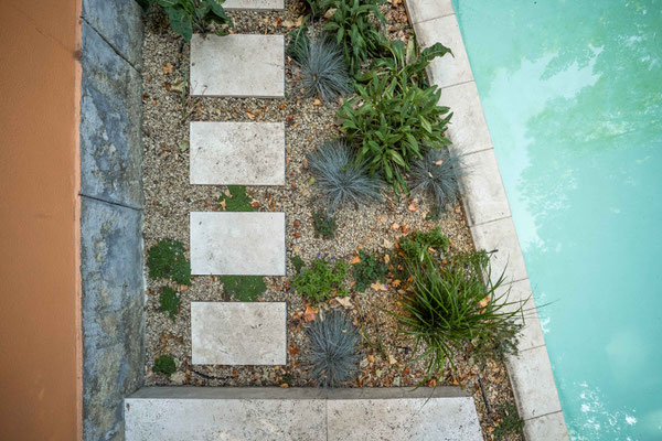 Mit der Idee eines abgesenkten Gartenzentrums haben wir diesem Grundstück Tiefe und Spannung verliehen. Die massiven Stampfbetonmauern mit Travertin-Abdeckung fassen den 60 cm tiefer liegenden Bereich ein und schaffen einen geschützten Rückzugsort mit außergewöhnlicher Atmosphäre.