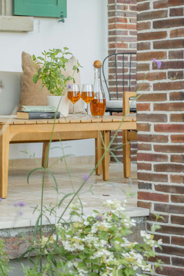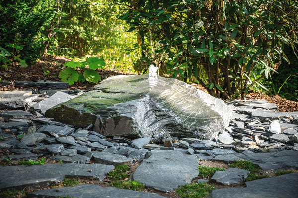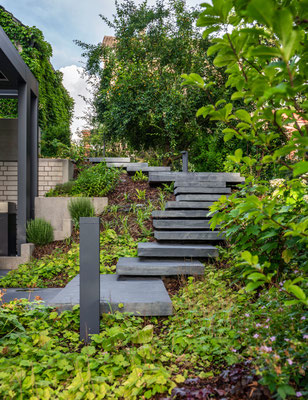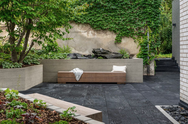 Dunkler Schiefer kontrastiert harmonisch mit dem weißen Klinker und schafft klare Linien und ruhige Übergänge. Schattenverträgliche Stauden und dezente Wasserspiele verleihen dem Ort Leichtigkeit und Tiefe.